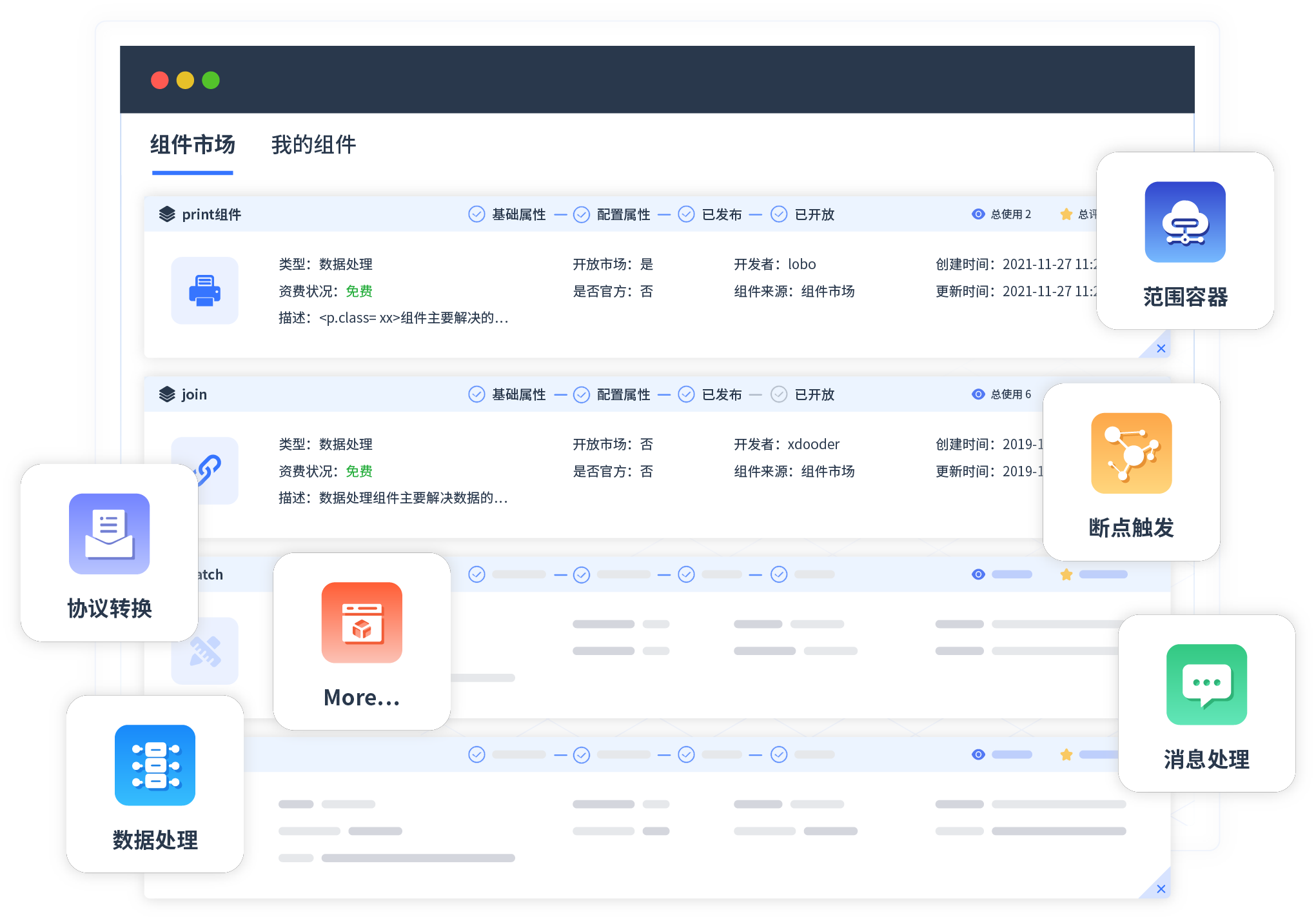 针对集成场景,NO钱包提供组件市场,例如协议转换、消息处理、文件操作等。除平台提供的组件外,客户可以自定义所需组件。